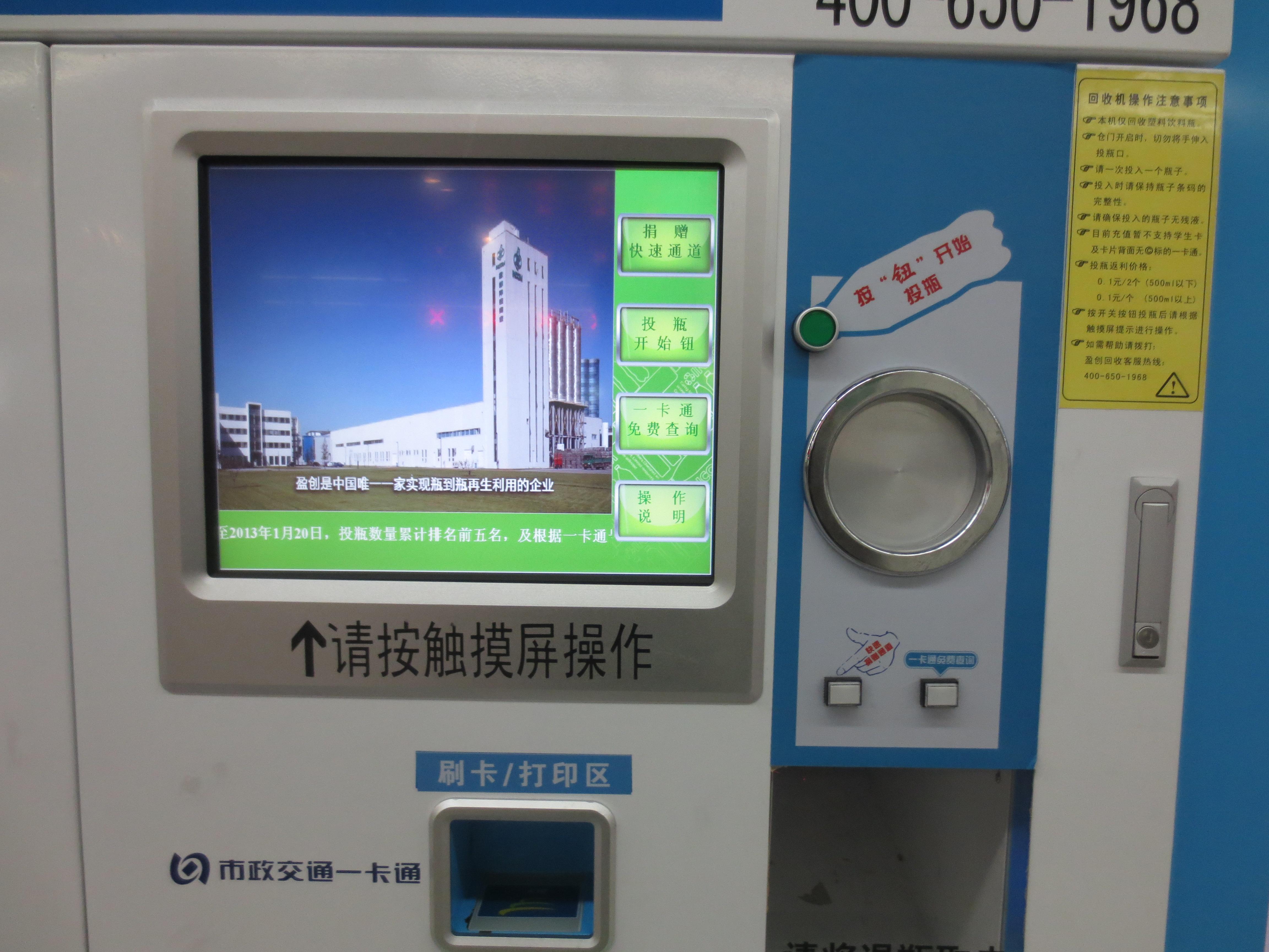 مسافران متروهای پکن بجای دور انداختن بطری های خالی آب، انتخاب بهتری دارند. آن ها می توانند این بطری ها را به ماشین های بازیافت بدهند و در مقابل آن پول دریافت کنند. برای هر بطری با گنجایش بیش از 500 میلیتر 0.1 یوان و برای بطری های کوچکتر 0.05 می پردازند. جالب اینجا است که مسافران می توانند بجای دریافت پول کارت های الکترونیکی که برای سیستم حمل و نقل در پکن استفاده می کنند را شارژ کنند، که به نظر می رسد ره حل مناسبی است و با استقبال روبرو می شود.